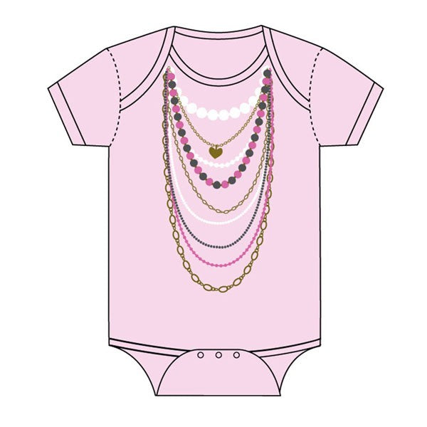 Baby Snapsuit - Pink body with pearl necklaces. A super cute fashionista snapsuit with a classy design featuring a pearl necklaces.