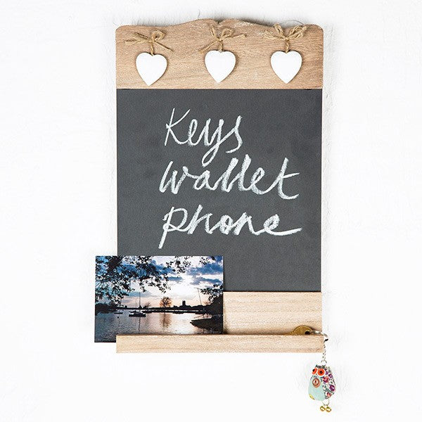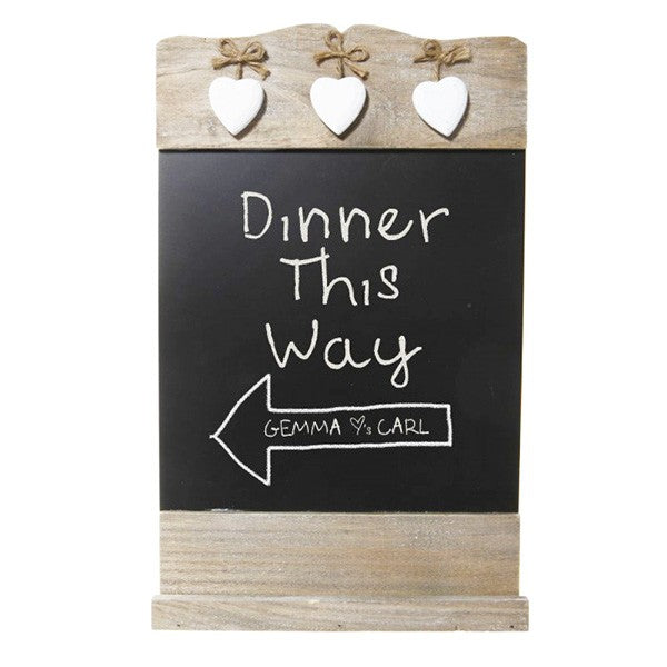 This beautiful wooden chalkboard decorated with three hanging hearts will add a vintage charm look to any interior. Just as perfect for everyday use such as remembering to buy milk, as for special events such a wedding, perhaps to indicate the way to the guests or to decorate the dessert table. Or why not simply use it to leave small love notes to each other at home :-)