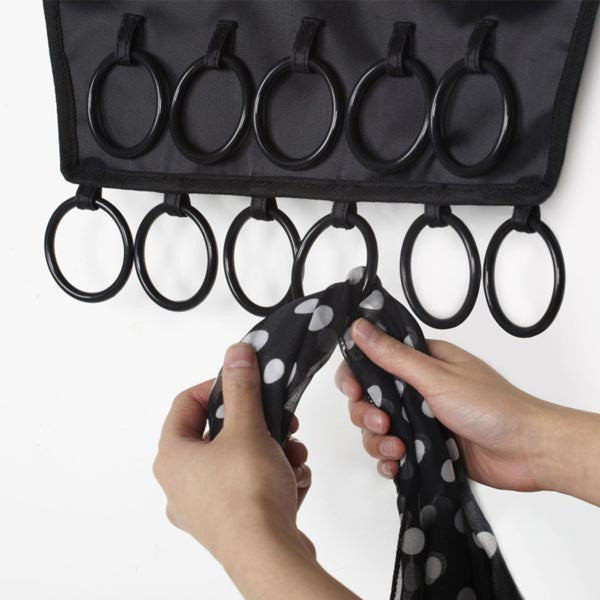 The Boho dress scarf organizer features 16 rings on which to hang your scarf collection. It is made of black polyester fabric with plastic rings and a metal hook that rotates 360 degrees for easy access and full visibility.