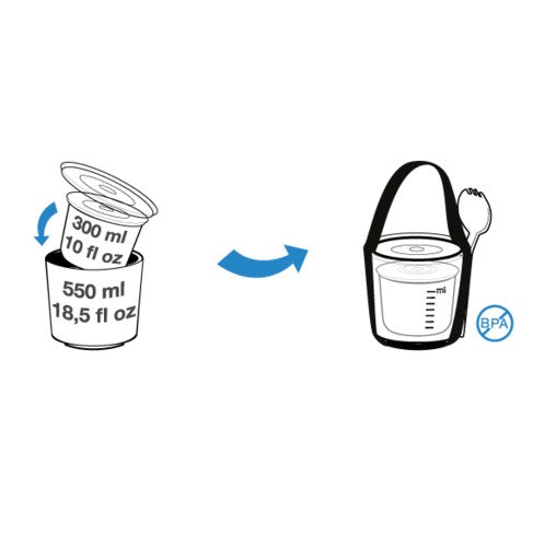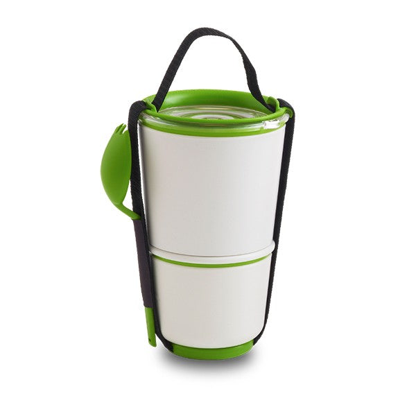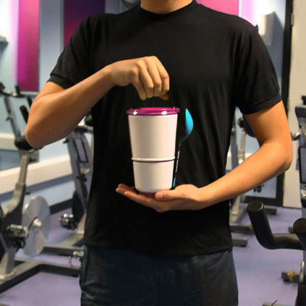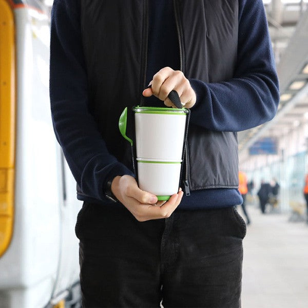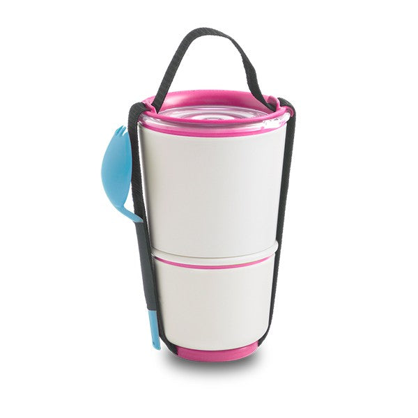 The two pots have an ingenious watertight locking seal. It allows you to separate your yogurt and cereals, soup and salad or pasta and fruit slices. Once you’ve finished eating, you simply put the smaller pot inside the large pot for compact carrying.