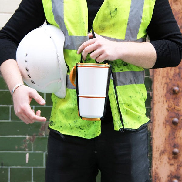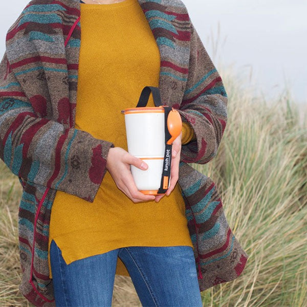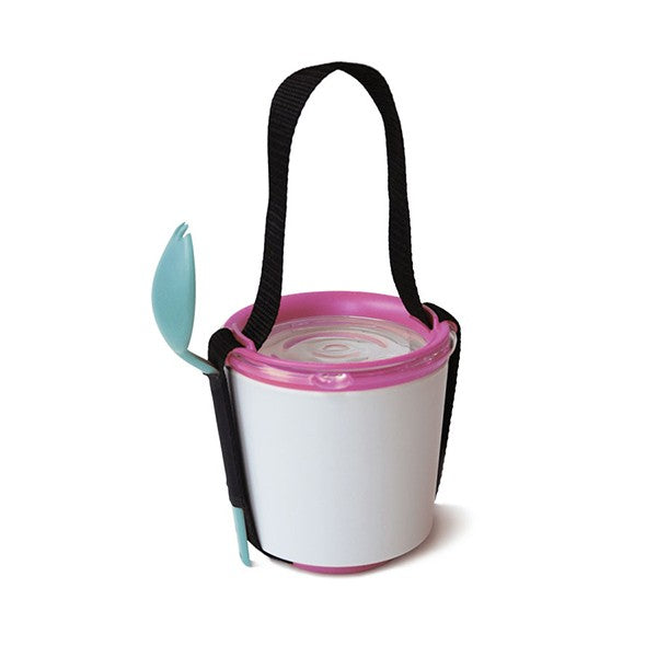 The design is slim and tall which makes it easy to keep upright in your bag. There is also a rugged strap if you want to carry it in your hand and it comes ready with a spork (spoon + fork) on the side.
