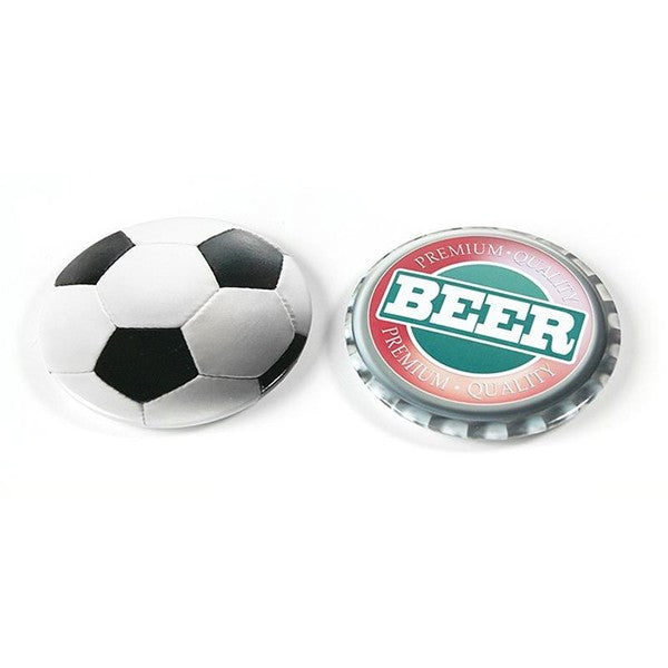 Never lose your bottle opener again with this set of 2 fun and functional magnetic bottle openers in the shape of a football and a beer capsule. Opens bottles effortlessly and is guaranteed to never get lost. No need to ever search for that missing opener again, it's always where it should be, right on the fridge.