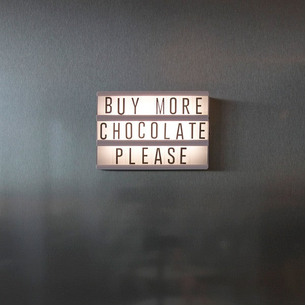 With this mini lightbox you can decorate any metallic surfaces with a glowing litte messages. Perfect on the fridge, maybe with a reminder of what needs to be picked up in the store, or simply let it stand in the bookshelf as a cosy evening night. This battery-powered light box is small and easy to move around and place on any surface that may require an enlightened little quote.