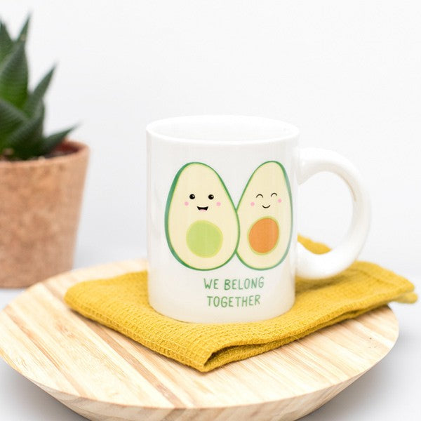 The white ceramic mug features a charming image of happy avocados with cute smiley faces and the phrase "We belong together". A perfect gift for a partner or friend at Valentine’s Day, birthday or an anniversary. Naturally the mug is microwave and dishwasher safe