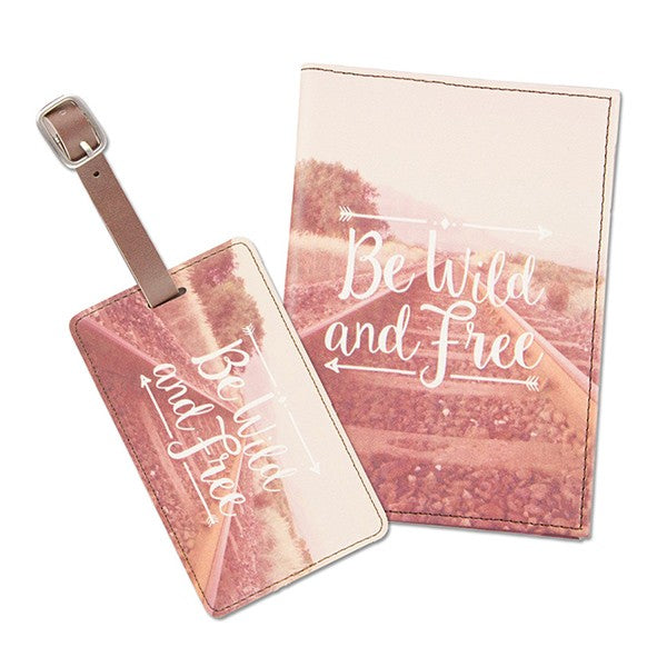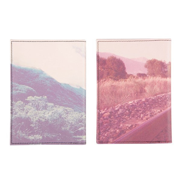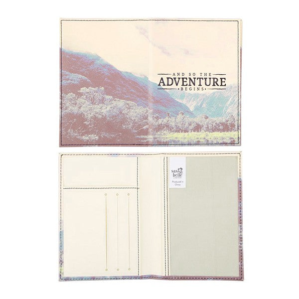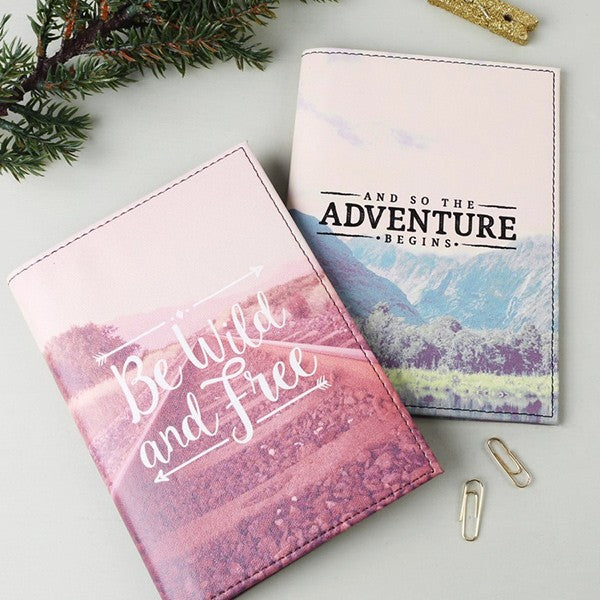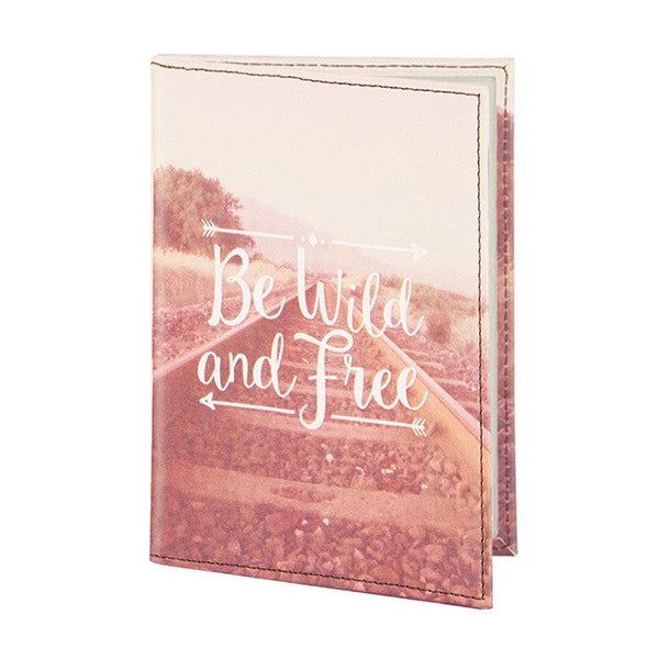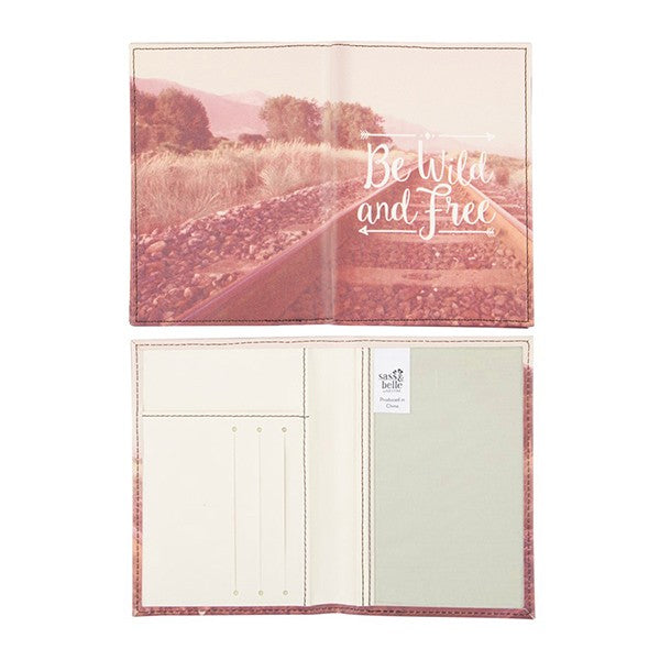 The case has small pockets on the inside where you can put smaller travel documents and cards. Choose between the case with the text "Be wild and free" against a background of a railroad or the other with the text "And so the adventure begins" against a background of a landscape.