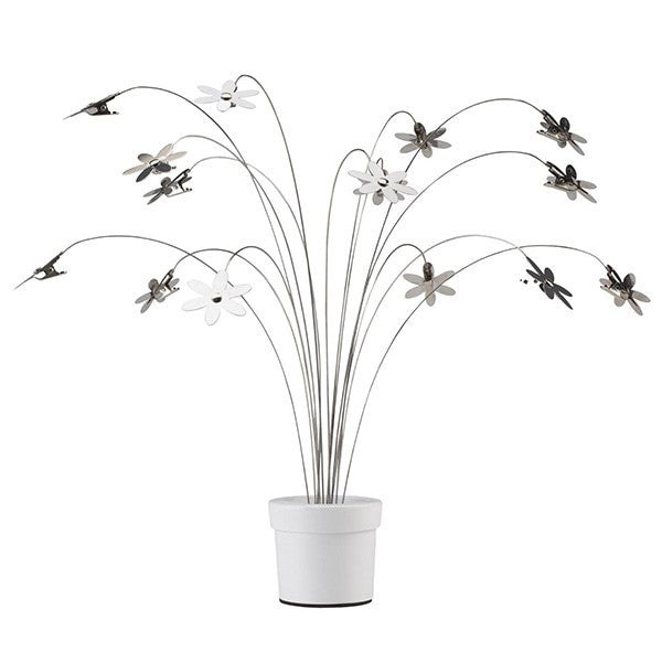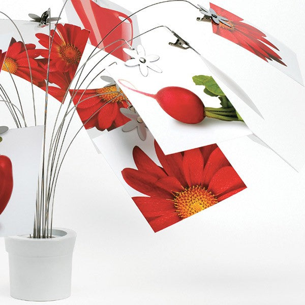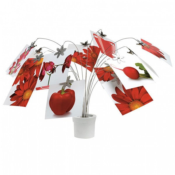 From the white flower pot 15 sprouts rise up, each one terminating with a stainless steel flower with a clip on it's back for attaching the photo.