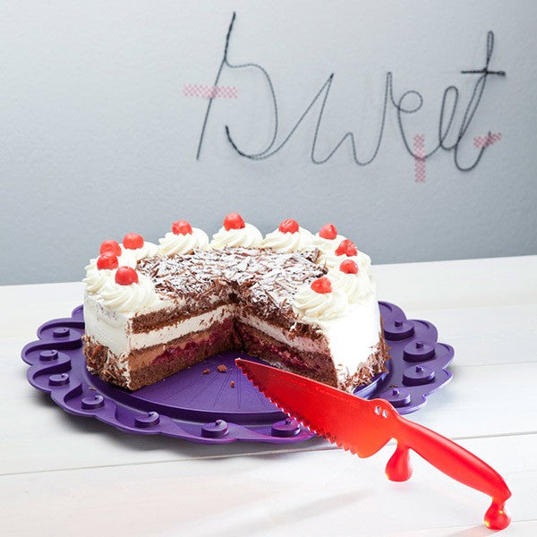 The Koziol Coco plastic knife has an adorable playful design but don't let it fool you. It cuts lettuce, bread and fruit as well as pastries and cakes. Since it is made out of plastic it ensures no damage is made to your non-stick pans. When it is not being used, it stand on its own feet helping keeping the table clean.