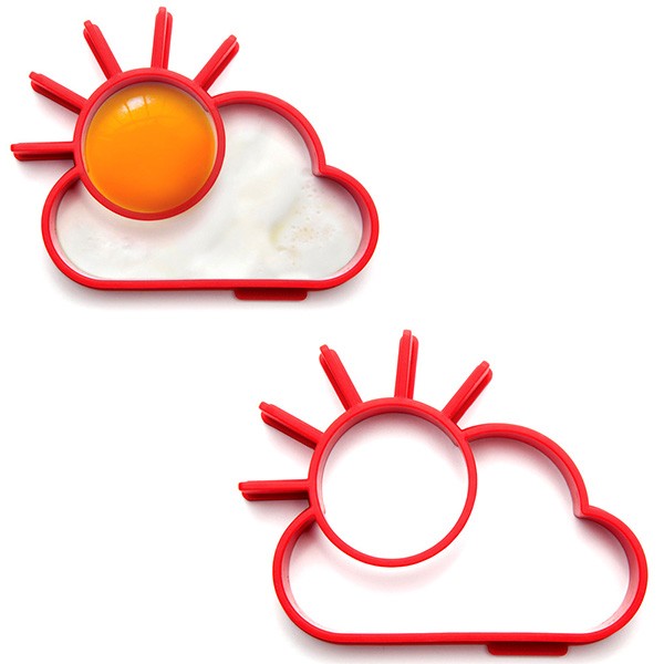 - Egg mold that creates fried eggs in the shape of the sun peaking out behind a white cloud.