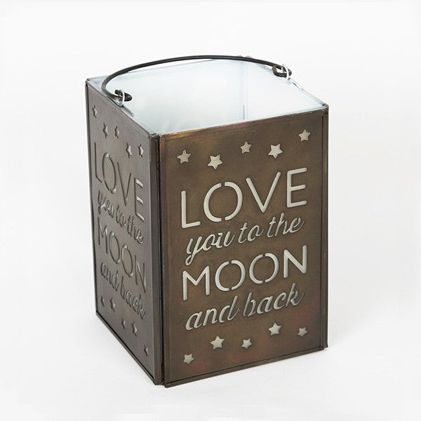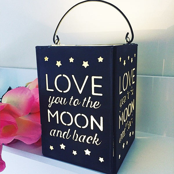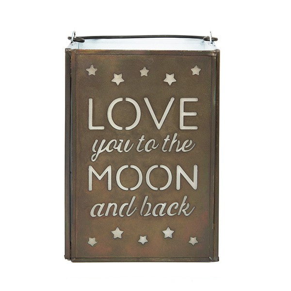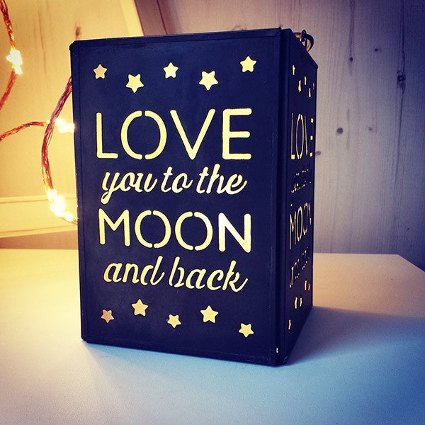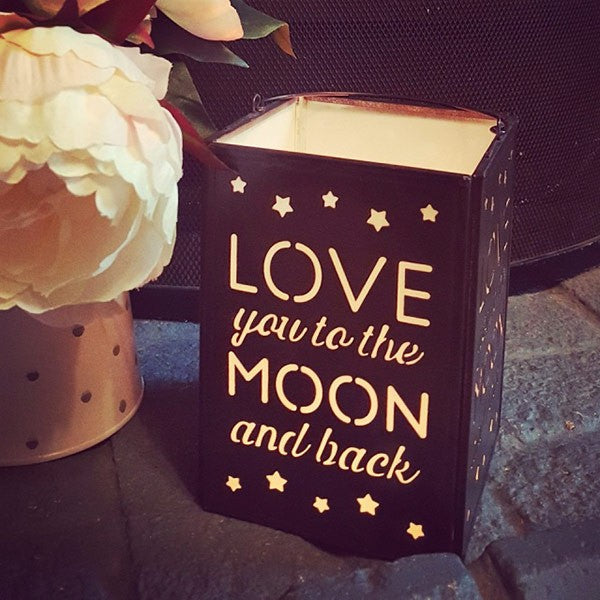 This lovely tealight holder made from steel and glass is perfect for holding candles that twinkle into the night. It has the sweet quote "Love you to the moon and back" MOON AND BACK engraved complementing its modern and industrial style with a soft message. A perfect accessory for romantic dinners.