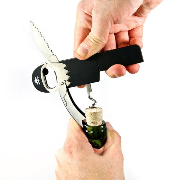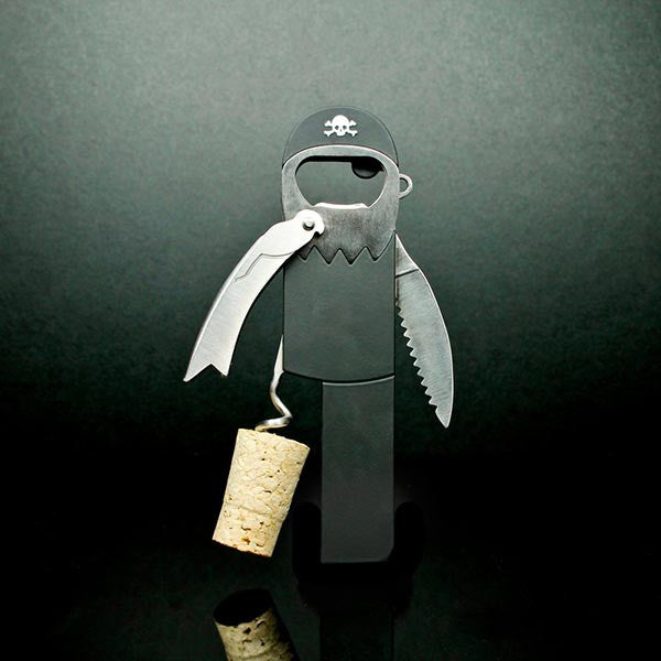 Cuando descorches una botella, se convertirá en un pirata con pata de corcho, y no le falta detalle: lleva un piercing, pañuelo en la cabeza, el parche en el ojo, barba y, si te fijas bien, su tradicional mascota: un loro en el hombro. La cabeza sirve de abrebotellas y uno de los brazos sirve para cortar el aluminio del cuello de la botella de vino.