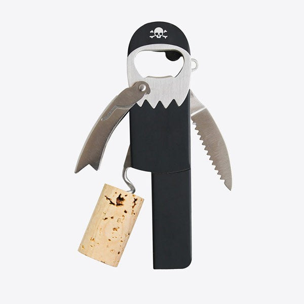 Divertido y práctico sacacorchos en forma de pirata. Incorpora un sacacorchos, un abrebotellas y un cortacápsulas.