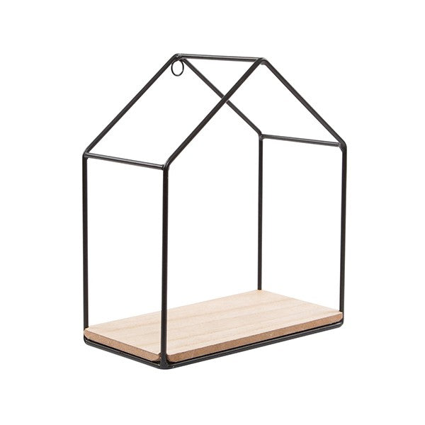 Estantería moderna con forma de casita, perfecta para destacar una planta o tus cosas favoritas. La estructura es de hierro y con estante de madera y tiene un bucle en el centro para poder fijarla a la pared. Diseño minimalista y limpia que le pondrá un toque moderno a la habitación donde la coloques que no se le escapará a nadie.