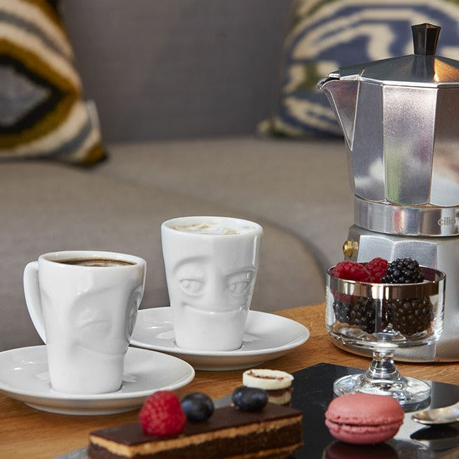 Taza de espresso con diseño único en forma de cara. Las tazas de café están fabricadas en porcelana usada en hostelería de la máxima calidad.