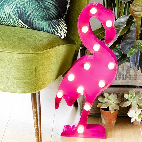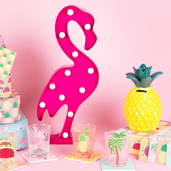 Apúntate a la moda tropical de los flamencos con esta bonita lámpara. Esta lámpara decorativa en forma de flamenco rosa dará un toque de estilo original entre retro, pop y tropical a cualquier habitación. Esta hecha de metal lacado con pequeñas bombillas LED que ilumina con una agradable luz cálida.