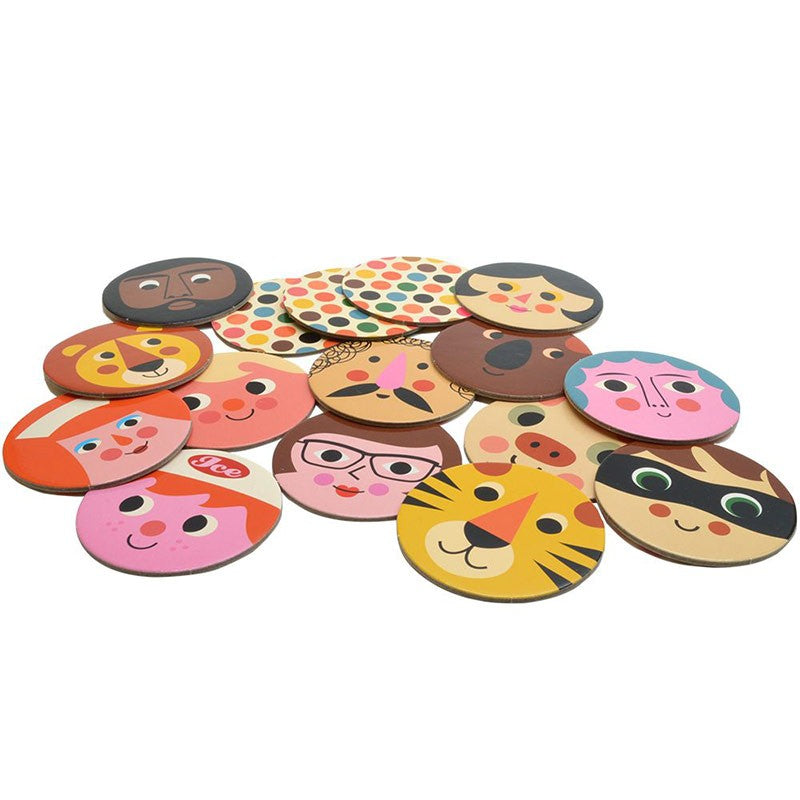 Esta nueva versión del clásico juego de la memoria contiene 25 ilustraciones circulares de "caras" de personas y animales. ¡Dale la vuelta a dos de ellas y a ver si consigues que sean iguales!