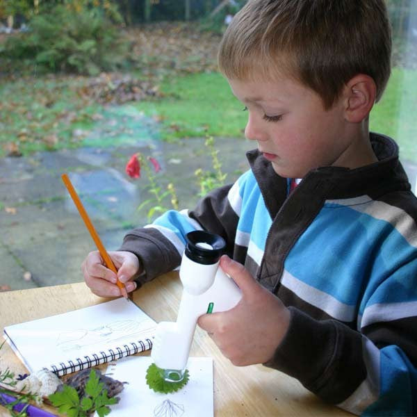Cabe perfectamente en una mochila del cole o un bolsillo grande. Es de plástico resistente y tiene un protector de goma para apoyar el ojo. No necesita pilas y el enfoque ajustable permite el estudio de todo tipo de cosas. Puedes descubrir los detalles de todas las cosas de la naturaleza, como bichos o flores. Los menos aventureros pueden optar por mirar las fibras de la ropa o la marca de aguas de un billete de 5 €. No te pongas límites y explora.