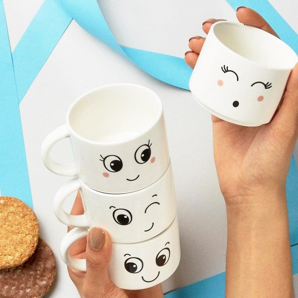 Tazas de café apilables con caras divertidas