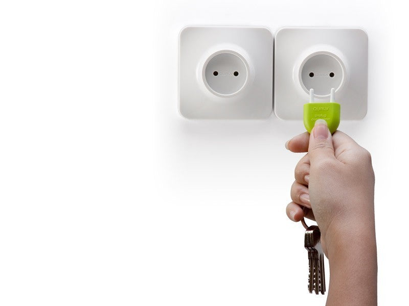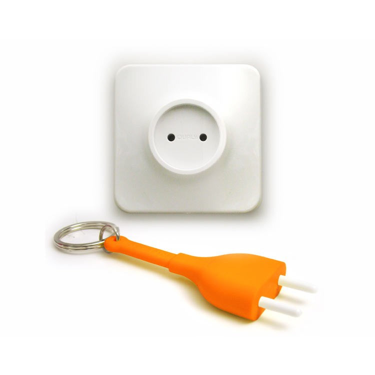 El enchufe de colores hace de llavero y va contigo al salir de casa. A la vuelta, naturalmente conectas el enchufe en su toma de corriente. Un detalle de decoración de hogar original que te ayuda a no volver a perder nunca más tus llaves.