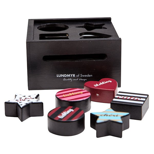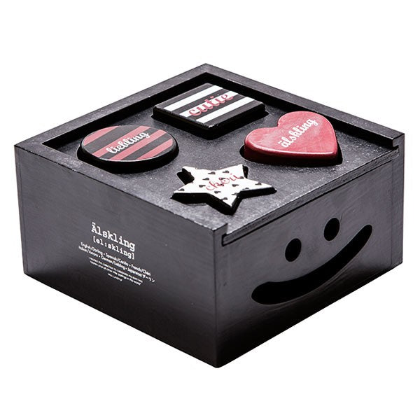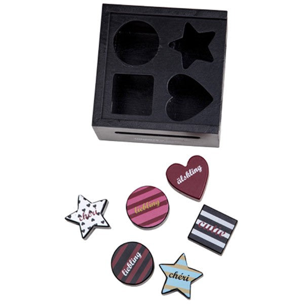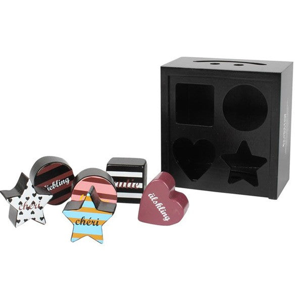 Una caja bonita y bloques de madera. Los bloques tienen imprenta de pequeños saludos de amor en diferentes idiomas. 6 bloques en diferentes modelos y colores incluidos.